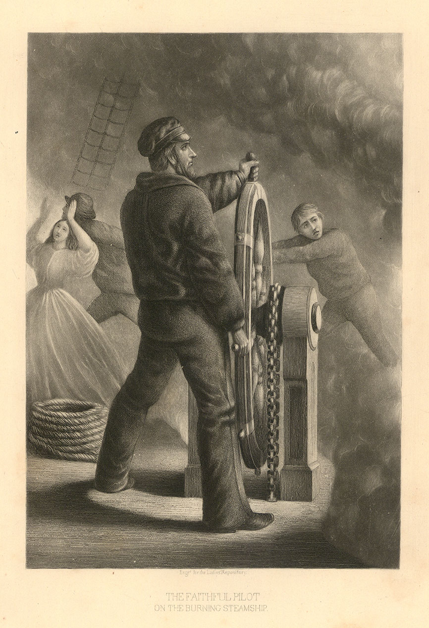 DESCRIPTION: This dramatic scene titled The Faithful Pilot on the Burning Steamship captures the harrowing moment when a steamship is engulfed in flames. While passengers frantically flee for their lives, the pilot remains steadfast at his station, embodying courage and duty amidst the chaos. During the 19th century, steamship disasters were tragically frequent, often caused by boiler explosions, fires, or collisions, making scenes like this all too common. This engraving not only highlights the perilous nature of steam travel at the time but also serves as a poignant tribute to the bravery of those who faced such dangers with unwavering resolve.