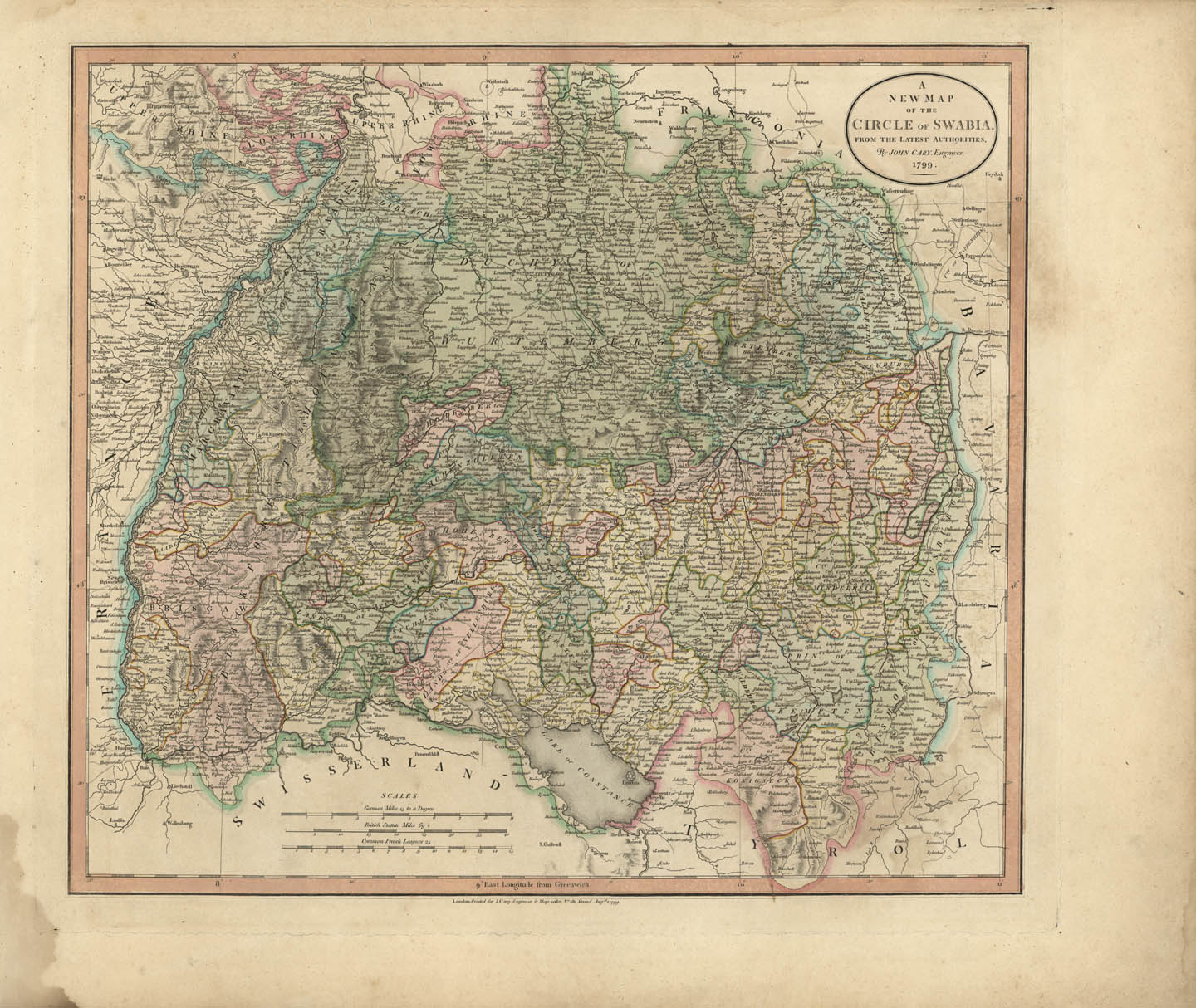 DESCRIPTION: During the Early Modern period the Holy Roman Empire was divided into Imperial Circles, administrative groupings whose primary purposes were the organization of common defensive structure and the collection of imperial taxes. Swabia is a cultural, historic and linguistic region in southwestern Germany. It appeared in Cary's New Universal Atlas.