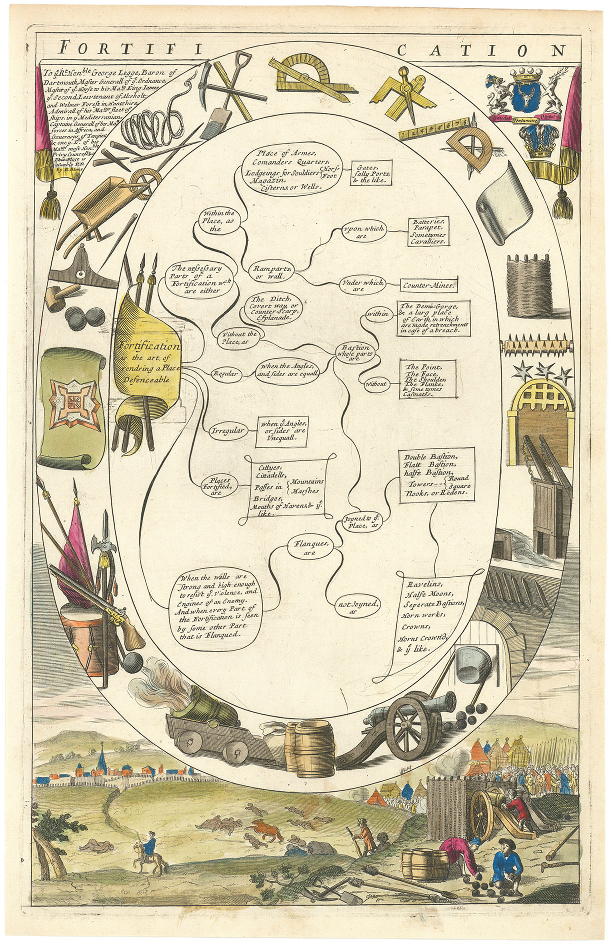 DESCRIPTION: A graphic sheet on the subject: "Fortification or the art of rendring a Place Defenceable." From "The Gentleman's Recreation" a two-part work, consisting of an Encyclopaedia of the Arts and Sciences and a treatise on outdoor pursuits for gentlemen. Compiled and published by Richard Blome (1635-1705).