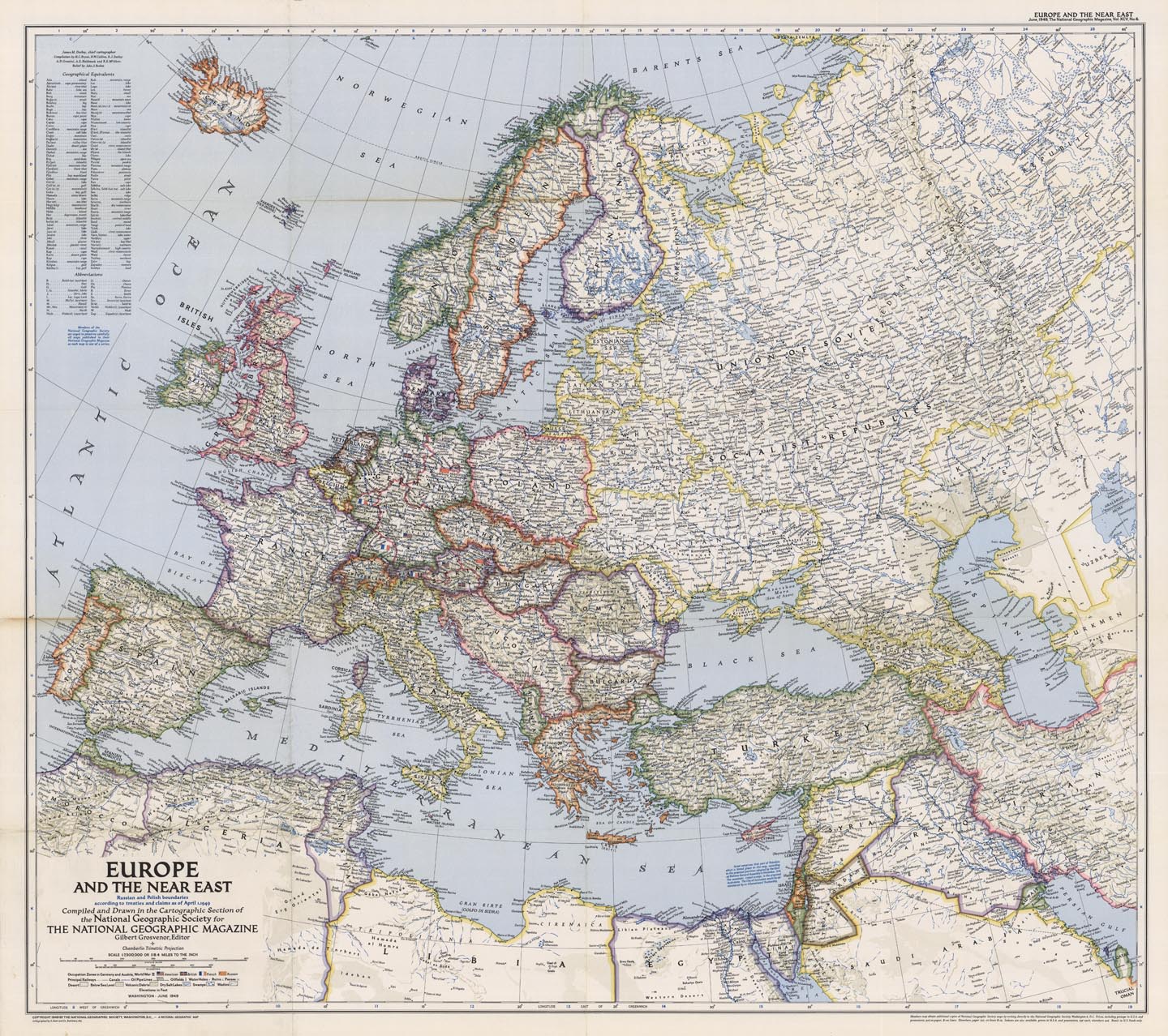 DESCRIPTION: Compiled and drawn in the cartographic section of the National Geographic Society for the National geographic Magazine. Gilbert Grosvenor. Editor. Printed by A. Hoen & Co. Baltimore, MD.<br><br> Israel is noted in green and has a note about its founding, "Israel comprises that part of Palestine which is tinted in green on this map, according to the proposed partition adopted by the United Nations General Assembly in November 1947. The remainder, tinted orange, is the proposed Arab state. The City of Jerusalem would be administered by an International Trusteeship."