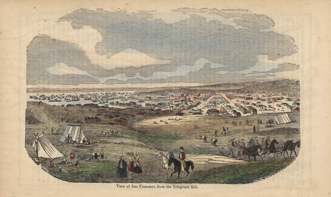 DESCRIPTION: A 19th-century perspective of San Francisco from Telegraph Hill, circa 1850, captured as a wood engraving and colorized to highlight the details.