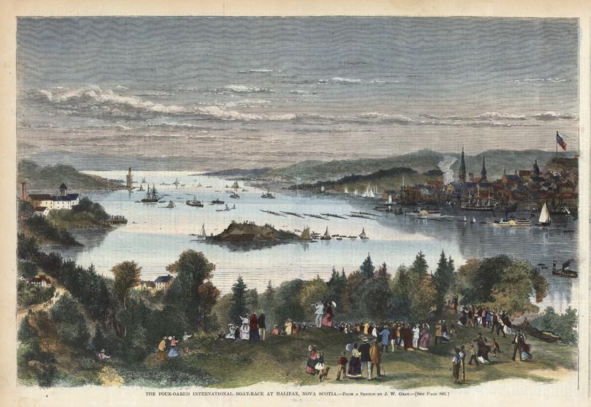 DESCRIPTION: This race took place at Halifax, Nova Scotia on August 31, 1871. The great four-oared boat-race for the championship of the world, contested by two British crews (both from the Tyne), one from the United States, and three from the Canadian or British American Provinces, took place in the harbor. The course rowed was from the Halifax Yacht Club-House to M'Nab's Island, a distance of six miles. The two English crews stripped bare, as is their custom. The Halifax men failed to overtake Winship's four, who came in winners by a length and a half; Chambers' crew were third, two lengths behind the Pryor crew, and the Biglin crew finished half a length in rear of the third. The Barton crew were fourth, and the Roche crew, who were hopelessly beaten, were last.