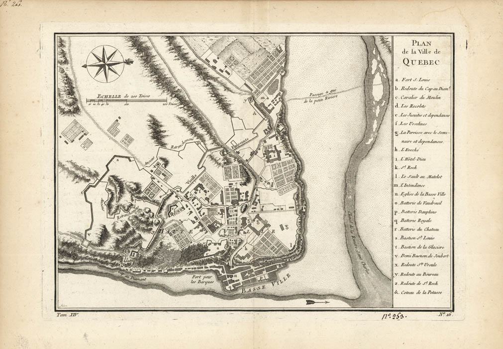 DESCRIPTION: A fine early map of the city of Quebec showing the city's fortifications with a key at right identifying the major buildings. This map appeared in Prevost's "L'Histoire Generale des Voyages".<br><br> The cartographer Jacques Nicolas Bellin (1703-1772) was one of the most important and proficient French cartographers of the eighteenth century. He was appointed the first Ingenieur Hydrographe de la Marine, and also the Official Hydrographer to the French King. <br><br>