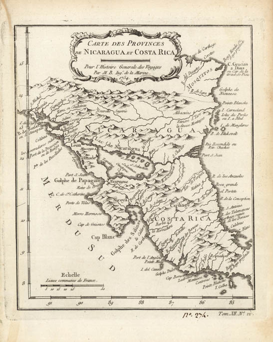 DESCRIPTION: Bellin’s detailed map of Nicaragua and Costa Rica that appeared in Prevost's "L'Histoire Generale des Voyages".<br><br> The cartographer Jacques Nicolas Bellin (1703-1772) was one of the most important and proficient French cartographers of the eighteenth century. He was appointed the first Ingenieur Hydrographe de la Marine, and also the Official Hydrographer to the French King. <br><br>