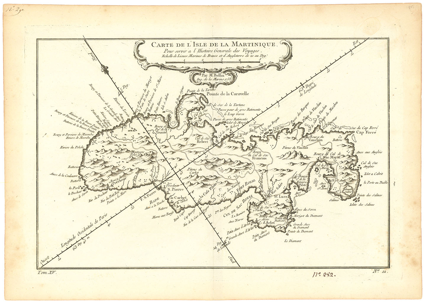 DESCRIPTION: "Carte de L'Isle de la Martinique" by Jacques Nicolas Bellin, published in 1758, is a masterfully detailed map from Prevost's "L'Histoire Generale des Voyages." As the first Ingenieur Hydrographe de la Marine and the Official Hydrographer to the French King, Bellin was a key figure in French cartography during the eighteenth century. <br><br> This map not only captures the intricate geography of Martinique but also highlights its economic and strategic significance during a period of intense colonial competition in the Caribbean. The accuracy and detailed rendering of the island's ports and fortifications reflect the meticulous work of Bellin, making this print an essential resource for understanding the maritime history and colonial dynamics of the time. Its combination of precision and historical value makes it a standout piece for collectors and historians alike.