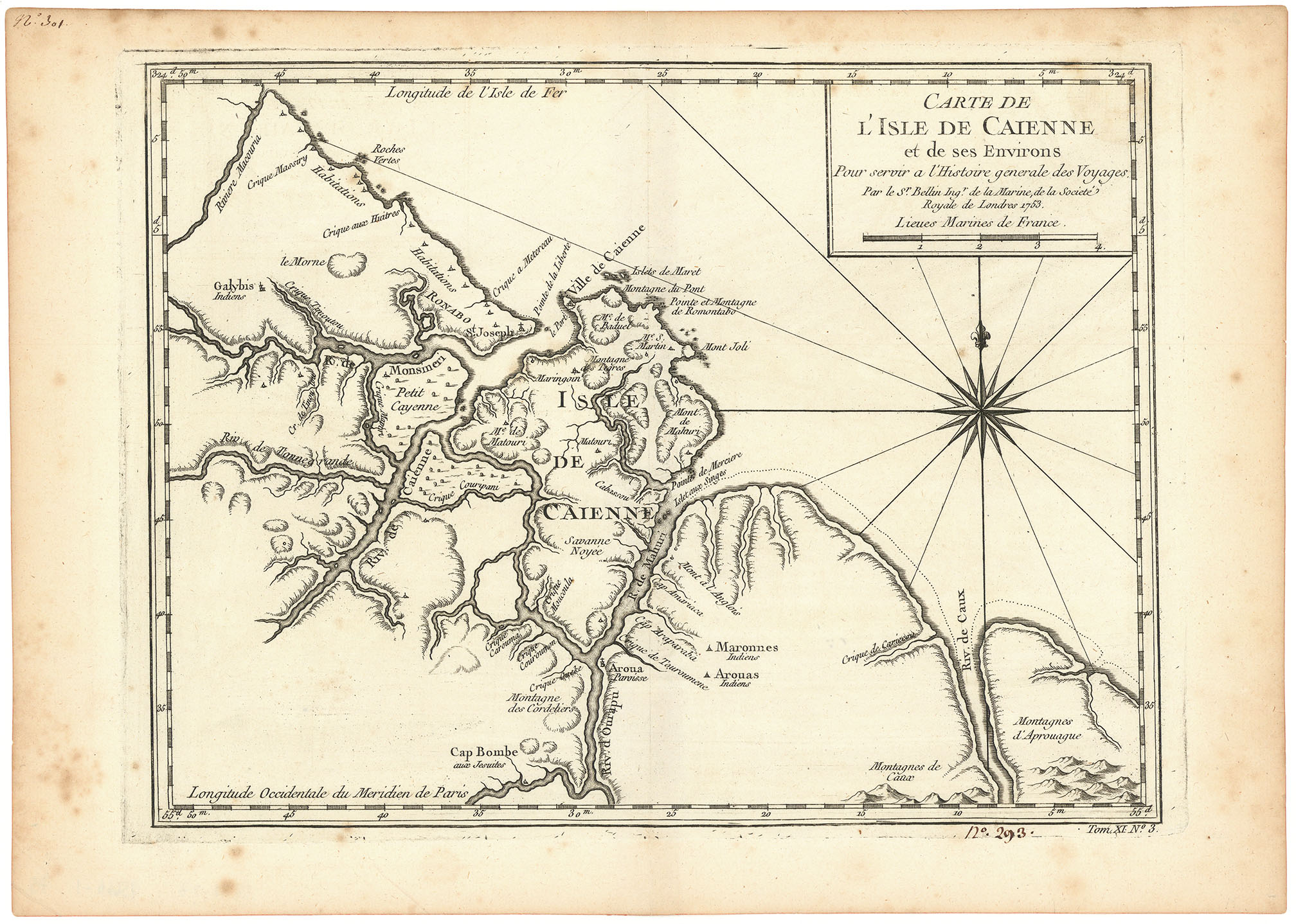 DESCRIPTION: Bellin’s detailed small map of island and surrounding area of Cayenne. This map appeared in Prevost's "L'Histoire Generale des Voyages".<br><br> The cartographer Jacques Nicolas Bellin (1703-1772) was one of the most important and proficient French cartographers of the eighteenth century. He was appointed the first Ingenieur Hydrographe de la Marine, and also the Official Hydrographer to the French King. Manuscript number in lower margin "No. 293"