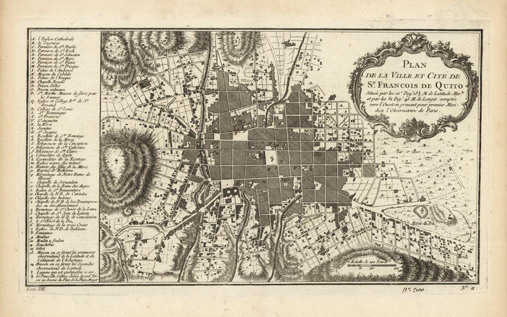 DESCRIPTION: A nice example of Bellin’s plan of the of Quito, Ecuador. A numbered and lettered key identifies dozens of locations and prominant buildings. This plan appeared in Prevost's "L'Histoire Generale des Voyages".<br><br> The cartographer Jacques Nicolas Bellin (1703-1772) was one of the most important and proficient French cartographers of the eighteenth century. He was appointed the first Ingenieur Hydrographe de la Marine, and also the Official Hydrographer to the French