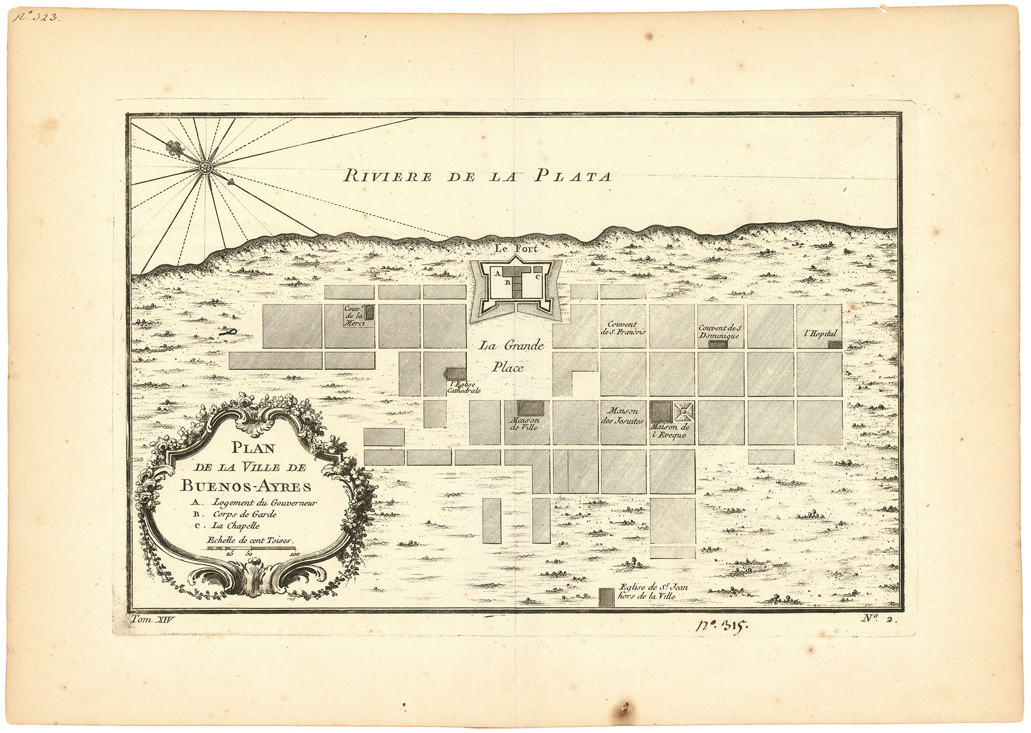 DESCRIPTION: A nice example of Bellin’s map of Buenos Aires, Argentina. This map appeared in Prevost's "L'Histoire Generale des Voyages".<br><br> The cartographer Jacques Nicolas Bellin (1703-1772) was one of the most important and proficient French cartographers of the eighteenth century. He was appointed the first Ingenieur Hydrographe de la Marine, and also the Official Hydrographer to the French. Manuscript number in lower margin "No. 315"