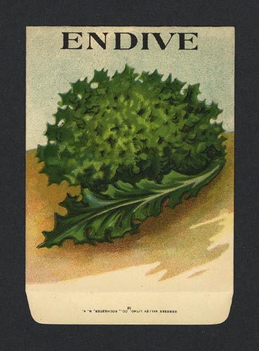 • DESCRIPTION: Generic unused seed package for endive. Card printed by the Genesee Valley Litho Co. Rochester, NY. The Genesee Valley Lithographic Company was a regional supplier of labels to the agricultural industry in Western New York.<br><br> Endive is a member of the chicory family. It has a crisp texture and a sweet, nutty flavor with a pleasantly mild bitterness and is served raw or cooked.