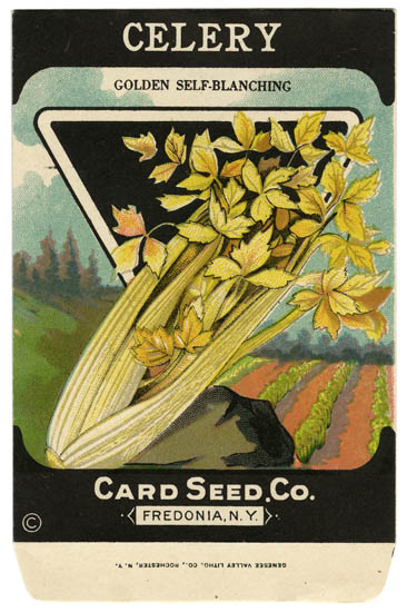 DESCRIPTION: An unused seed package for Celery (Golden Self-Blanching) issued by the Card Seed Company. The Card seed company was in business between 1908 and c.1925.<br><br>Card printed by the Genesee Valley Litho Co. Rochester, NY. The Genesee Valley Lithographic Company was a regional supplier of labels to the agricultural industry in Western New York