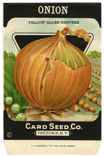 DESCRIPTION: An unused seed package for Onion (Yellow Globa Danvers) issued by the Card Seed Company, which was in business between 1908 and c.1925.<br><br> Card printed by the Genesee Valley Litho Co. Rochester, NY. The Genesee Valley Lithographic Company was a regional supplier of labels to the agricultural industry in Western New York