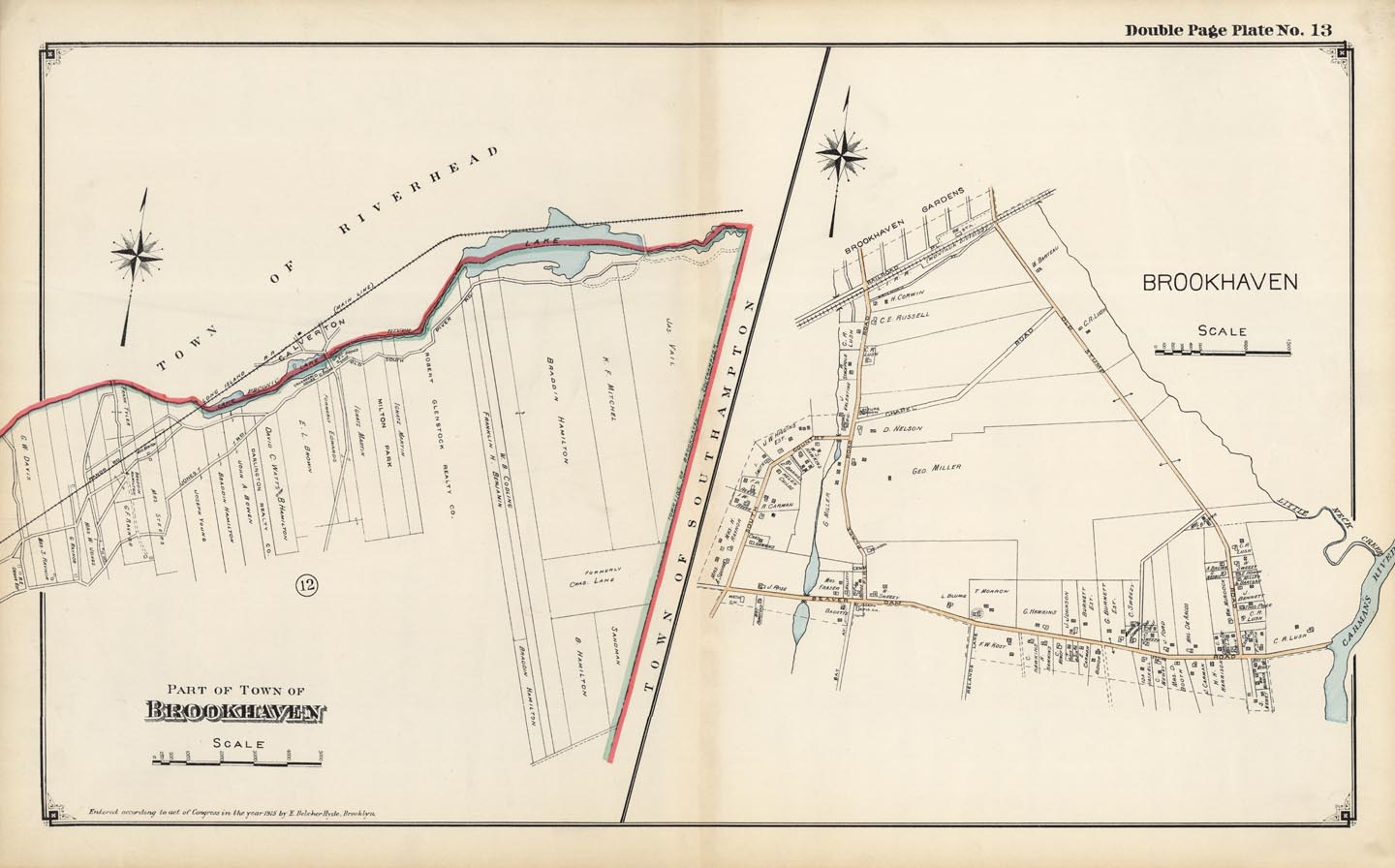 DESCRIPTION: Two maps on one sheet. Map on left shows Calverton and south of the Peconic River. The Brookhaven map shows the village itself. Property lines, outline of homes and landowners names are given. This map is from "Atlas of a part of Suffolk County, Long Island…."