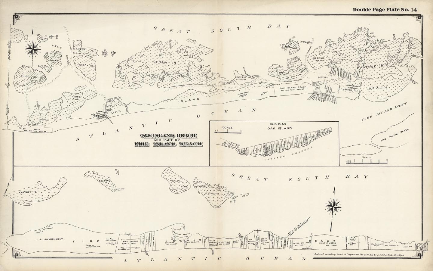 DESCRIPTION: This map shows two overhead views of the length of each island. There is also an inset of the "Sub Plan of Oak Island". Property lines, dwelling locations, and landowners' names are given. This map is from the "Atlas of a Part of Suffolk County, Long Island, New York."