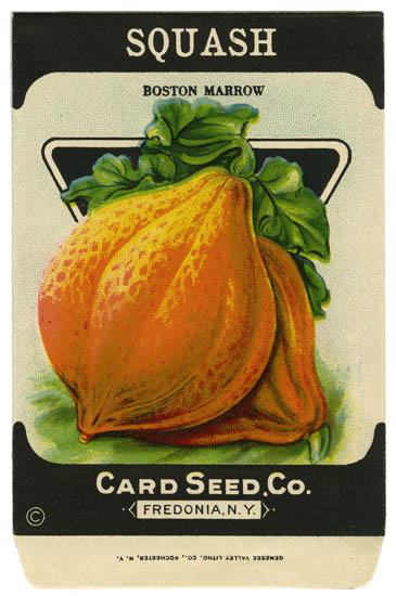 DESCRIPTION: An unused seed package for Squash issued by the Card Seed Company. The Card seed company was in business between 1908 and c.1925.<br><br> Card printed by the Genesee Valley Litho Co. Rochester, NY. The Genesee Valley Lithographic Company was a regional supplier of labels to the agricultural industry in Western New York.