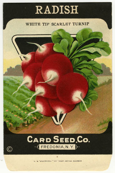 • DESCRIPTION: An unused seed package for Radish issued by the Card Seed Company. The Card seed company was in business between 1908 and c.1925.<br><br>Card printed by the Genesee Valley Litho Co. Rochester, NY. The Genesee Valley Lithographic Company was a regional supplier of labels to the agricultural industry in Western New York