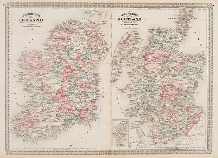 DESCRIPTION: This map was published in "Johnsons New Illustrated Family Atlas of the World." A nice bright and well colored impression of this map. Map includes clearly defined counties, cities, and towns. A finely engraved calligraphic border surrounds the map.