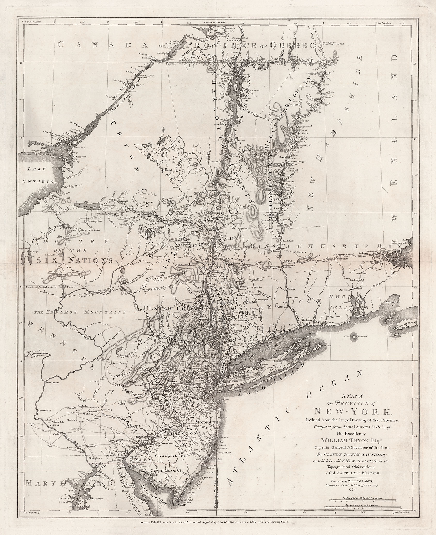 DESCRIPTION: A good example of this map that was made from the "topographical observations" of Claude Joseph Sauthier and Bernard Ratzer. Areas and towns along the rivers are well delineated. When this map was made, New York State claimed all the area that is now Vermont. On the Connecticut River towns such as Lebanon, Hanover, Lime are noted. It may be the first engraved mention on a map of Dartmouth College. Illustrated in Nebenzahl's "Atlas of the American Revolution" Map No. 37, pp. 158-60.