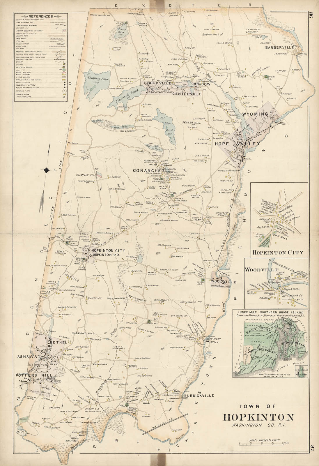 DESCRIPTION: A handsome and quite detailed large scale map The map notes roads, ponds and homes along with the owners names. The Wood River branch R.R. is shown running between Hope Valley and Woodville. Inset maps show Hopkinton City and Woodville. Appeared in Everts & Richards "Atlas of Rhode Island."