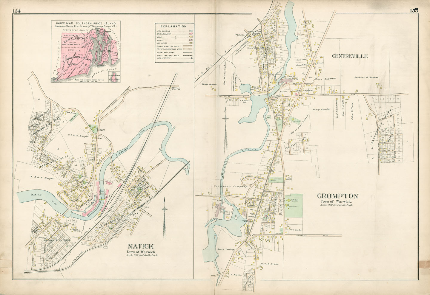 DESCRIPTION: A handsome and quite detailed large scale map of these villages within the town of Warwick. The maps notes roads, rivers and homes along with the owners names. Appeared in Everts & Richards "Atlas of Rhode Island."
