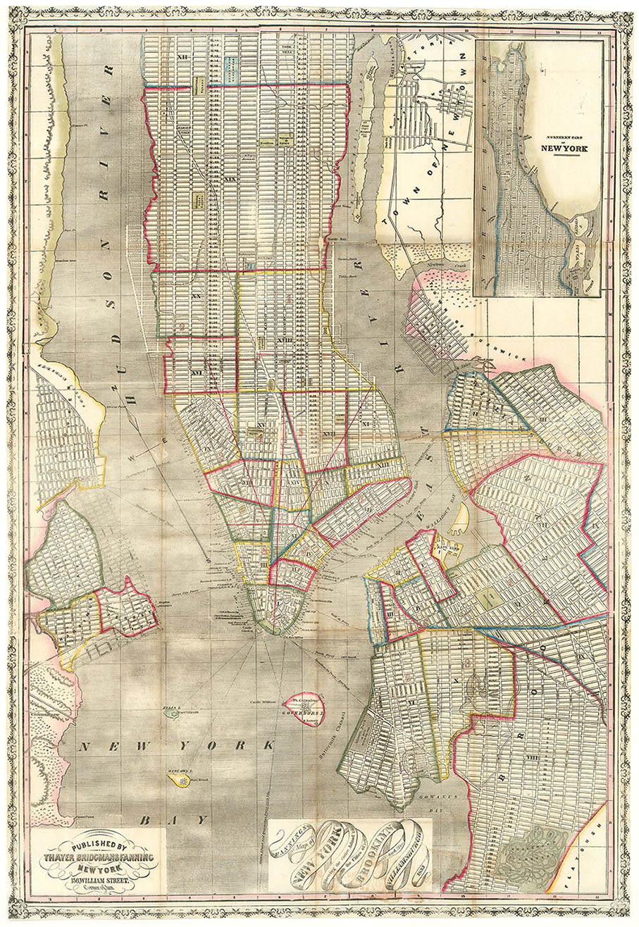 DESCRIPTION: A scarce and somewhat unusual map of the city.<br><br> Central Park does not exist yet. Large parts of the island are shown just before being land filled, Castle Garden is still in the harbor. Many wharfs and ferry's are identified. Harbor defenses are identified, Fort Columbus and Castle William on Governors Island. Fort Gibson on Ellis Island and Fort Wood on Bedlows Island. (Later Liberty Island). Greenwood cemetery is laid out in its elaborate design.<br><br> Original outline color by ward. Retains but removed from original hard covers. Covers include 28 page street directory.