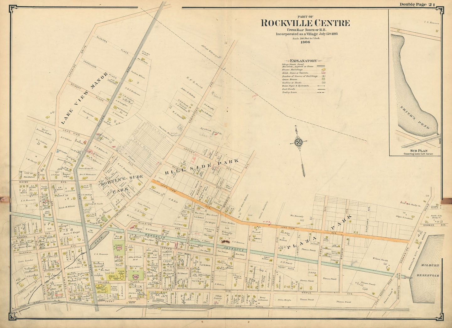DESCRIPTION: A detailed plan of the town. Notes lots, buildings and their owners. Along with creeks, rail lines etc. Key identifies paved and unpaved roads, wooden or brick buildings etc. Inset map shows sub plane, connecting lower left corner. This map appeared in Hyde's very scarce oversized "Atlas of Nassau County Long Island N.Y." <br><br>