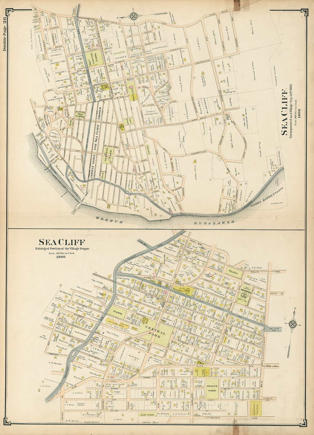 DESCRIPTION: Detailed plan of the town. Map on left gives a close up of the village. Notes lots, buildings and their owners. Along with creeks, rail and trolley lines etc. Key identifies paved and unpaved roads, wooden or brick buildings etc. This map appeared in Hyde's very scarce oversized "Atlas of Nassau County Long Island N.Y."