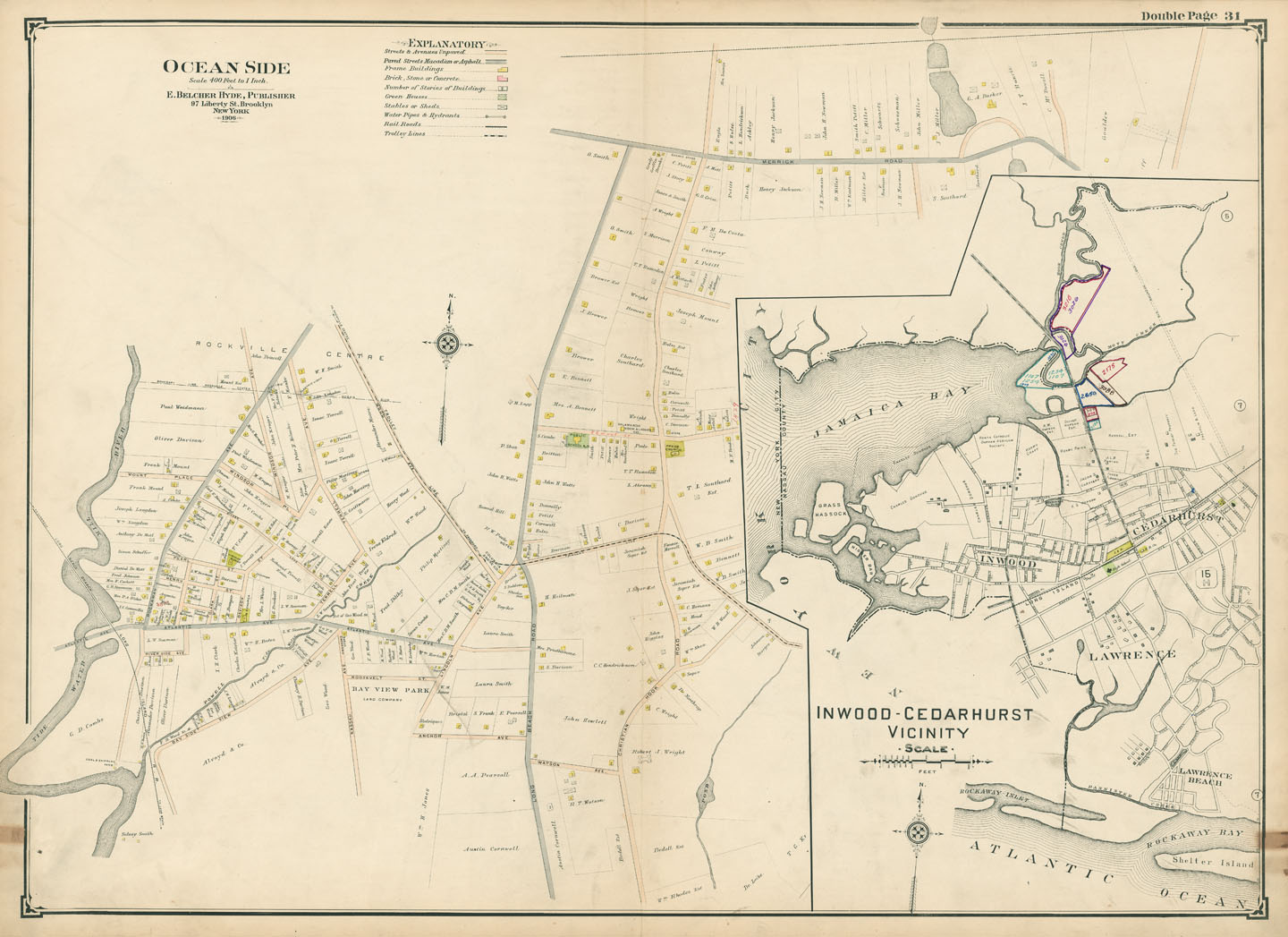 DESCRIPTION: Detailed plans of the towns. Notes lots, buildings and their owners. Along with creeks, rail and trolley lines etc. Key identifies paved and unpaved roads, wooden or brick buildings etc. This map appeared in Hyde's very scarce oversized "Atlas of Nassau County Long Island N.Y." <br><br>