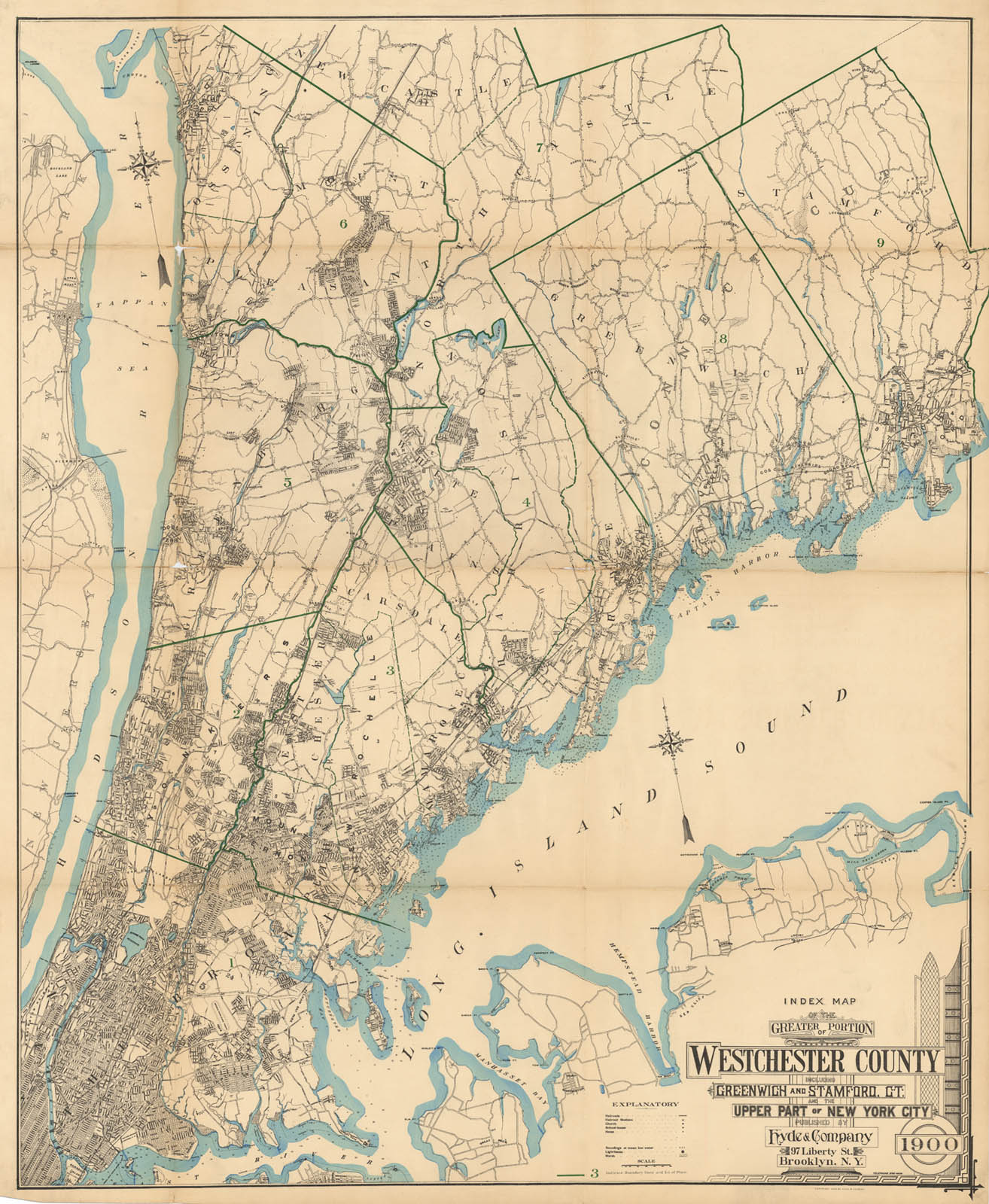 DESCRIPTION: Title continues: "Including Greenwich and Stamford, Ct. and the Upper Part of New York City". This map shows the southern half of Westchester County, going only as far north as Sing Sing (Ossining) on the Hudson River. The entire New York City borough of the Bronx is also included. To the east the town of Stamford, Ct. extends past the border, right up to the paper edge. Published and sold as a case map, there are both vertical and horizontal creases. Details include street names, Long Island Sound coastal soundings, and compass points.
