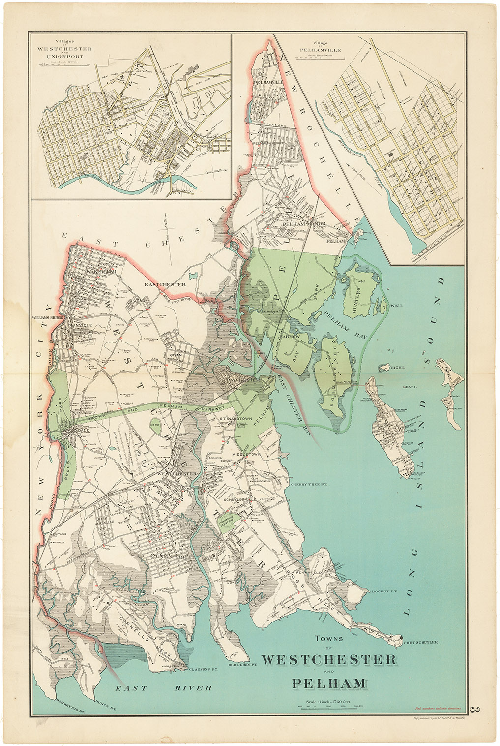DESCRIPTION: A map of these villages along the Long Island Sound. Shows an area from Cornells Neck to Pelham, including Throgs Neck & City Island. Identifies roads, homes, estates, public buildings and in many cases gives the owners name. This map appeared in Joseph R. Bien's "Atlas of Westchester County.