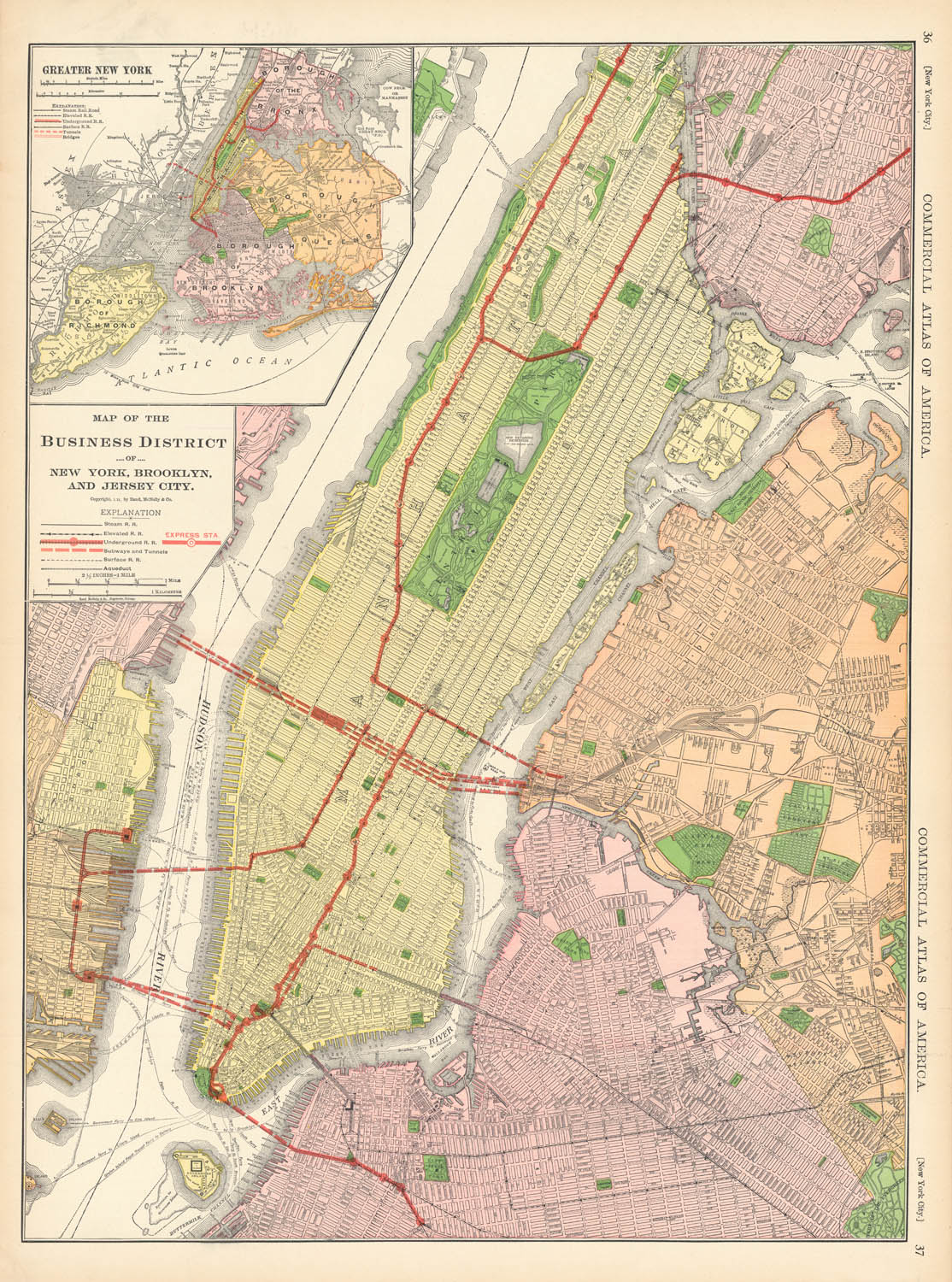 DESCRIPTION: A large detailed map from “Rand McNally & Company’s Enlarged Business Atlas and Shippers Guide.” This map shows a early depiction of the subway and elevated railway system. Many ferry routes are noted as well.