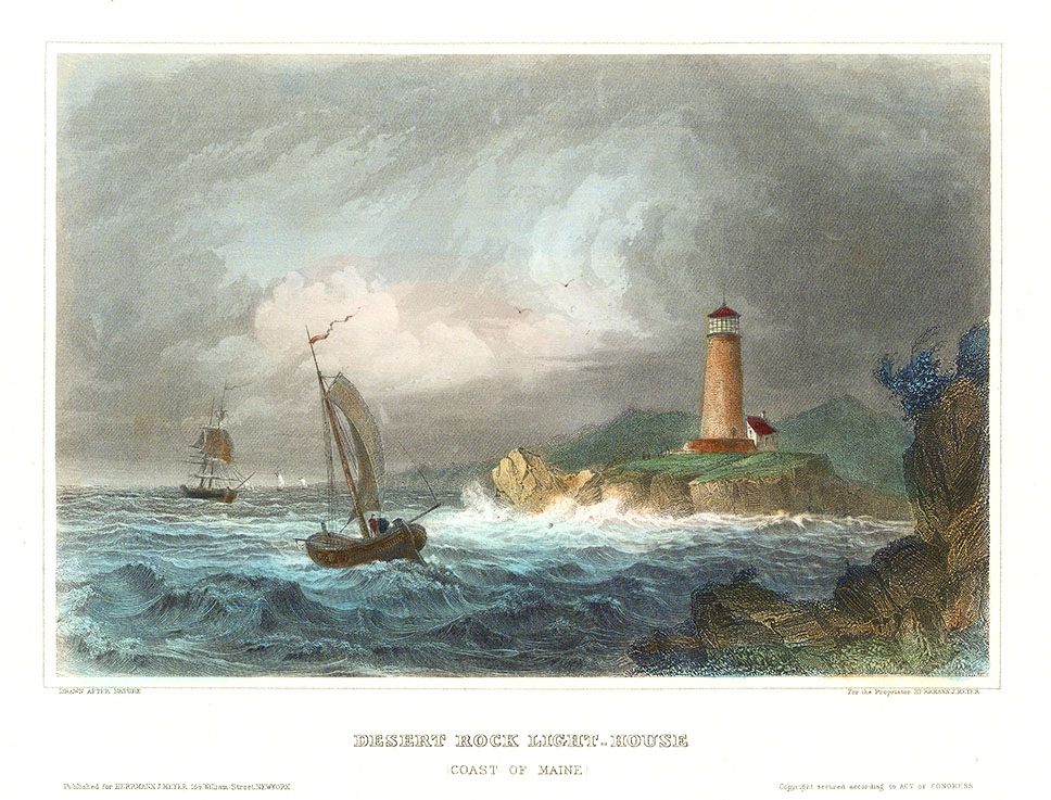 DESCRIPTION: Mount Desert Light is a historic lighthouse located on Mount Desert Rock, about 18 nautical miles south of Mount Desert Island in Maine. Established in 1830, the current conical granite structure, designed by architect Alexander Parris, was built in 1847. The structure build by Parris in 1847 is the lighthouse depicted in this engraving.