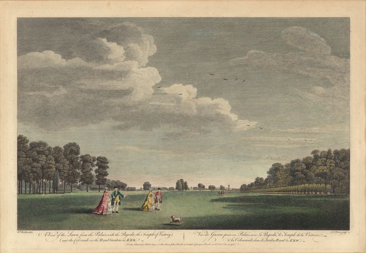 DESCRIPTION: Wm Woollett delin. J.S. Mason Sculpt. A view from Kew Palace, aka “The White House”.<br><br> In the distance is the newly built Great Pagoda. The Pagoda was completed in 1762 as a gift for Princess Augusta, the founder of the Gardens. It was one of several Chinese buildings designed for Kew by Sir William Chambers.<br><br> The plate was engraved by Mason after the painting by William Woollett for William Chambers’s Plans, Elevations, Sections and Perspective Views of the Gardens and Buildings at Kew, published in 1763 and dedicated to the Dowager Princess of Wales. The publication was ‘undertaken by Royal Command’ and funded ‘by Royal Bounty’. <br><br> Title given in English and French. <br><br> Kew Gardens, formally the Royal Botanic Gardens, Kew, is today one of the finest botanic gardens in the world.