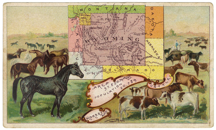 DESCRIPTION: The Arbuckle Coffee Company was founded by John and Charles Arbuckle, two brothers who helped to transform the coffee industry.<br><br> In 1881, they patented their coffee roasting machine and were the first to sell roasted beans in 1 pound packages. Making coffee far more accessible and certainly a better quality due to the roasting process. Prior to that coffee beans were sold green and you have to roast your own beans.br><br In the 1880s, the Company began to include advertising trade cards with their coffee, small cards that advertised the company on one side and included a pleasing color lithographic image on the other. The Arbuckle cards were integral in making “trade” cards into “trading” cards, as the Arbuckle cards were released in numbered series. Customers were encouraged to collect complete sets and to trade duplicates. Many of the series included maps, including a state series, a city series, and a world series.<br><br> Geo. S. Harris & Sons (Philadelphia), Kaufmann and Strauss, and in New York City, Donaldson Brothers and Knapp & Co. printed the majority of the cards.