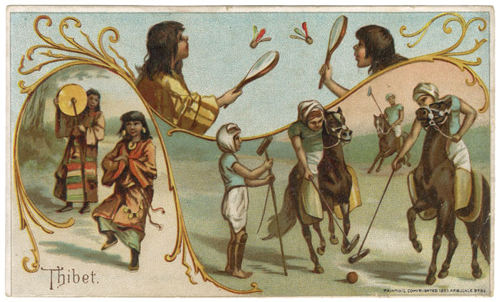 DESCRIPTION: The Arbuckle Coffee Company was founded by John and Charles Arbuckle, two brothers who helped to transform the coffee industry.<br><br> In 1881, they patented their coffee roasting machine and were the first to sell roasted beans in 1 pound packages. Making coffee far more accessible and certainly a better quality due to the uniform roasting process. Prior to that coffee beans were sold green and you have to roast your own beans.br><br In the 1880s, the Company began to include advertising trade cards with their coffee, small cards that advertised the company on one side and included a pleasing color lithographic image on the other. The Arbuckle cards were integral in making “trade” cards into “trading” cards, as the Arbuckle cards were released in numbered series. Customers were encouraged to collect complete sets and to trade duplicates. Many of the series included maps, including a state series, a city series, and a world series.<br><br> Depicted on this card are the games of battledoor, shuttlecock and Polo, the latter of which originated there according to Arbuckle.<br><br> Geo. S. Harris & Sons (Philadelphia), Kaufmann and Strauss, and in New York City, Donaldson Brothers and Knapp & Co. printed the majority of the cards.