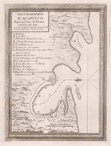 DESCRIPTION: A chart of the town and harbor of Acapulco from Masi's "Il Gazzettiere Americano." Published in Livorno, Italy. A key identifies fourteen points of interest.