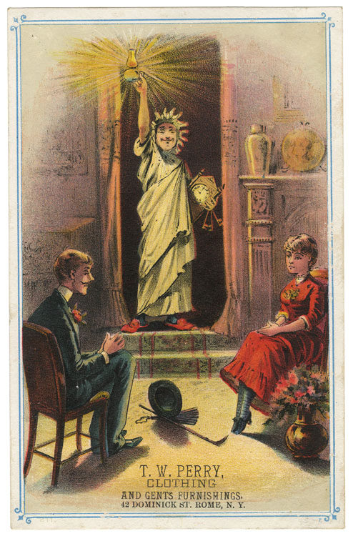DESCRIPTION: A trade card for the T.W. Perry company, playing on the Statue of Liberty. Blank back.