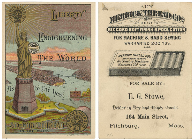 DESCRIPTION: A trade card for Merrick Thread. Printed by J.G. Lutz, Springfield, Mass. <br><br> The Merrick Thread Company was founded in the 1860s and was well regarded for it's three-cord thread when it began. As sewing machines came more into fashion, they began creating six-cord thread to meet the demands of the the new technology. In 1898 they were merged with a number of other thread companies to form the American Thread Co. <br><br> The Statue of Liberty rests in the foreground of the card. To the right is Castle Williams, which still stands on Governors Island. Even further in the background is the island of Manhattan with the Brooklyn Bridge spanning the East River.