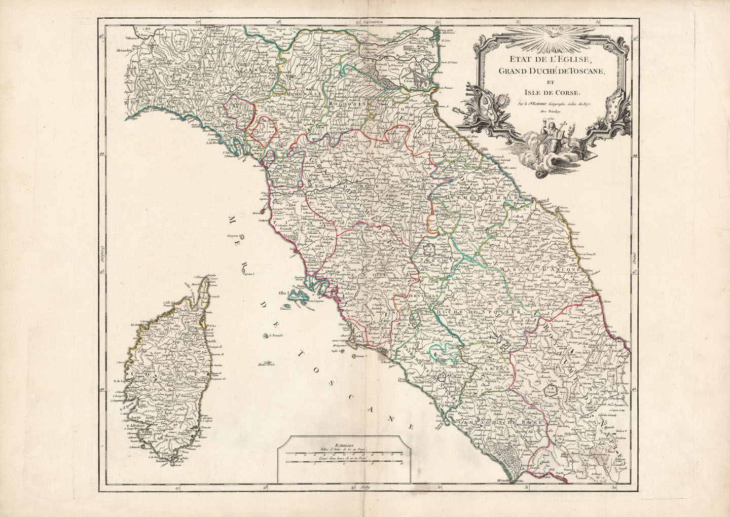 DESCRIPTION: A detailed map of central Italy, Tuscany and Corsica. Hundreds of towns and villages identified. This map appeared in DeVaugondy's "Atlas Universel".