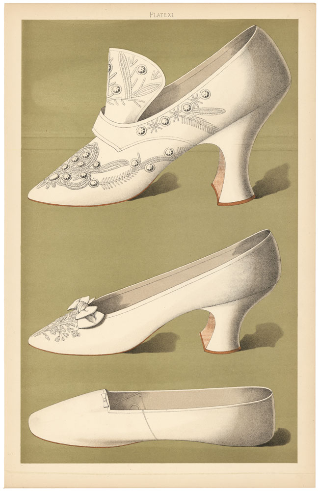 DESCRIPTION: From "Ladies Dress Shoes of the Nineteenth Century with sixty-three illustrations" by T. Watson Greig of Glencarse.<BR><BR> Text for plate XI:<BR> "This shoe of Cromwellian shape hails from the stage, and boasts the highest heel in the collection. It is thickly embroidered in small crystal beads studded with cabochons, the later also in clear crystal, which is a decoration difficult to beat. The wide tonge is kept in place by a strap, which would require a diamond or silver buckle to fasten it at the side, not visible in the illustration. the lining is of pale blue satin. <BR><BR> No. 2 is owned by a society belle, whose beauty may be said to extend from 'top to toe,' as the toe, or rather toes, encased in this foot-gear must be of the smallest and daintiest description, and demanding a share of the admiration granted to their lovely owner's figure and face. <BR><BR> The next shoe is a wedding shoe, looking strange to us in its old-world form, but the very mould of fashion in its day, which dates nearly forty years ago. "