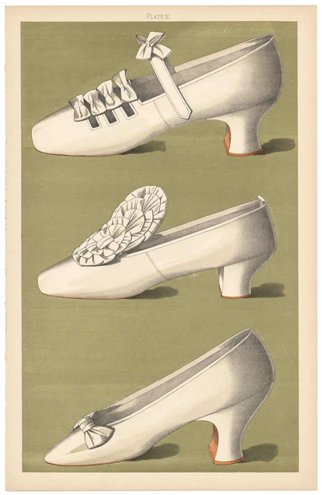 DESCRIPTION: From "Ladies Dress Shoes of the Nineteenth Century with sixty-three illustrations" by T. Watson Greig of Glencarse.<BR><BR> Text for plate IX:<BR> "The first shoe of this plate would be remarkable for neatness, though it might be thought somewhat spoilt by a squareness of toe, but it will be noticed the idea of squareness appears carried out otherwise in the cut of the shoe. The space between the principal strap and the three small ones crossing the foot makes an uncommon variety. The little bows of trilled silk (of which the shoe also is constructed) give a chic, if somewhat formal finish, to each band. the heel is a Louis shape. <BR><BR> Figure 2 belonged to an Edinburgh belle of the season of 1872, and is of tiny dimensions, though the old fashion of ornamenting with a large bow deprived the wearers of these small sizes of some of the credit. <BR><BR> The third and most elegant shoe possesses one of the highest Louis heels worn off the stage, and belonged to an American lady who, like several others, came to this country and acquired for herself the right to the motto first adopted by Alexander the Great - namely, 'Veni, Vidi, Vici."