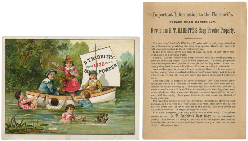 DESCRIPTION: This item is a trade card for B.T. Babbitt's Best Soap. Printed on the back are instructions on how to effectively use the product for different tasks, such as washing dishes and clothing. <br><br> Benjamin Talbot Babbitt was an American inventory and entrepreneur who made his mark in the soap industry in the 19th century. Cleaver and unique marketing tactics aided in his success, and made his company a household name.