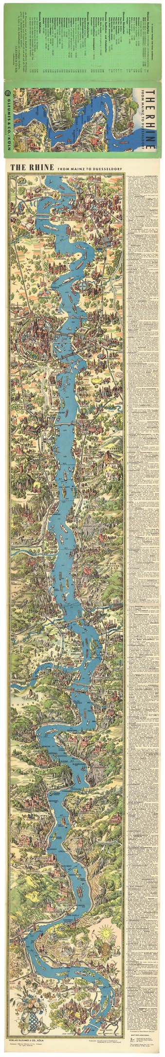 DESCRIPTION: A charming pictorial foldout guide map meant for those travelling up and down the Rhine River. Shows cities, towns, villages, bridges, castles, mountains and landmarks, basically anything a tourist would find interesting. Language on map is in English.