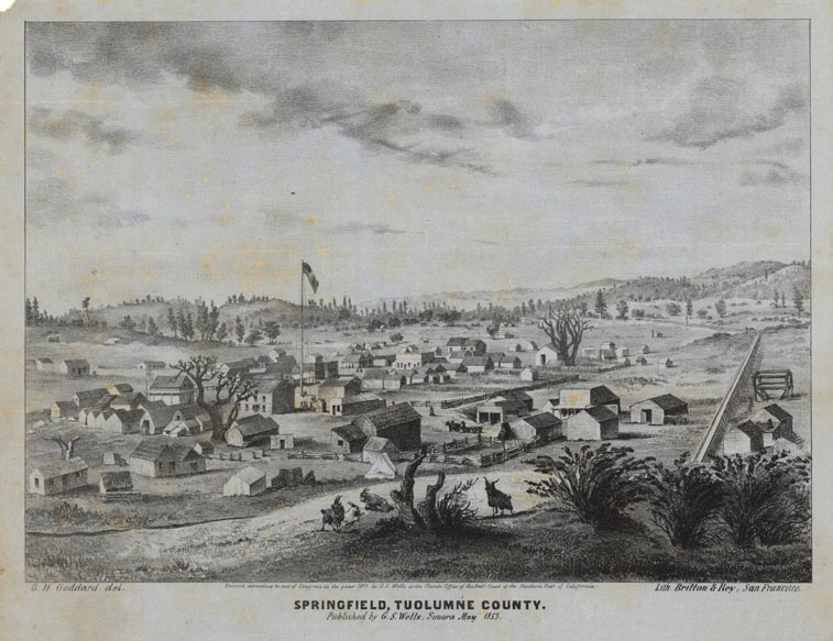DESCRIPTION: A 19th-century perspective of Springfield, Tuolumne County, a scarce and early lithograph by Britton & Rey of San Francisco. Printed on a grey toned paper. <br><br> This is the first and only nineteenth century view of Springfield, California, as noted by Reps. The image depicts the “town square, flagpole in center surrounded by scattered dwellings; goats on low knoll in foreground” (Peters, p. 78). Also visible on the right is what appears to be an elevated sluiceway coming into town from the hills beyond. <br><br> Named after the numerous springs in the area, Springfield was a Gold Rush boomtown located in the foothills of the Sierra Nevada Mountains. Around the time this view was created, the town comprised stores, shops, and a hotel, and was home to some 2,000 inhabitants. Springfield is believed to have been founded by Dona Josefa Valmesada, a Mexican woman who apparently aided Americans during the Mexican-American War (1846–48). Artist George H. Goddard (1817–1906) went on to become an important early surveyor in California.