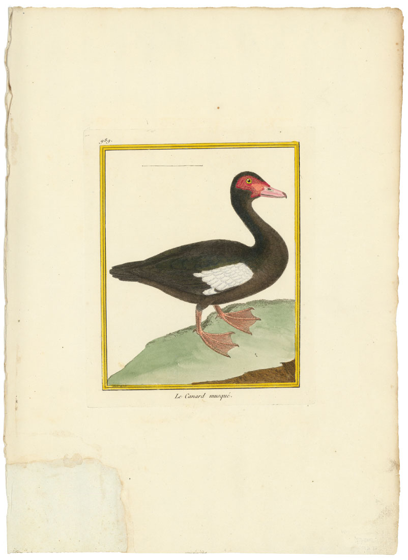 DESCRIPTION: Plate 989. From the 'grand-papier' folio edition of "Histoire Naturelle des Oiseaux" by de Buffon, George Louis LeClerc, Philib. Gueneau de Montbeillard, l'Abbe, Gabriel Leopold Charles Aime Bexon and Edme Louis Daubenton. Illustrated by Francois Nicolas Martinet. Published in Paris. <br><br> Due in large part to Martinet's skill, "This edition was certainly the most ambitious and comprehensive bird book which had appeared at the time of its publication, and ranks still as one of the most important of all bird books from the Collector's point of view." - Sitwell. <br><br> The muscovy duck is native to Mexico and Central and South America.