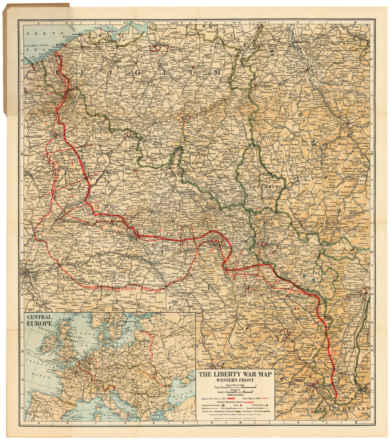 DESCRIPTION: A separately issued WW I map showing various battle lines. Heavy red line shows the lane as of Sept 1st, 1917, thin red line, July 1, 1916. Dotted red line, farthest German advance. Also notes forts and fortified places. <br><br>