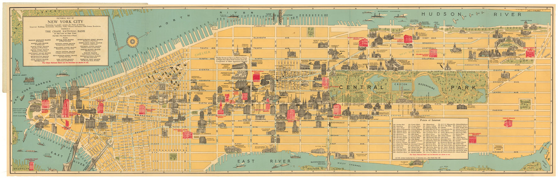 DESCRIPTION: A fun advertising pictorial map of New York City. This map was produced by Arthur Crosby Service, an advertising agency specifically for the Chase National Bank. All the branches are shown on the map in red. A “Points of Interest” key identifies 90 churches, attractions, prominent businesses, universities, parks, theaters, institutions and commercial buildings. Also noted on the map are the locations of “Famous Fifth Avenue Residences” belonging to prominent citizens such as Warburg, Frick, Havemeyer, Gould, Whitney and Guggenheim. Streets and avenues are white with some being overprinted with solid and dashed light blue lines that likely show street car and elevated train routes. Some neighborhoods are also labeled in light blue lettering including Ghetto in the lower east side of Manhattan. Roosevelt Island is simply named, Welfare Island. There are also ships in the rivers and harbors, including the ocean liner SS Leviathan, docked at pier 84 in the Hudson River. In the east village are a series of black printed figures that include a witch on a broomstick, a horse, pig, mouse, cat, coffee pot, owl, etc. One writer has deduced that these were likely speakeasies as the map was produced during Prohibition. An enjoyable map to study.