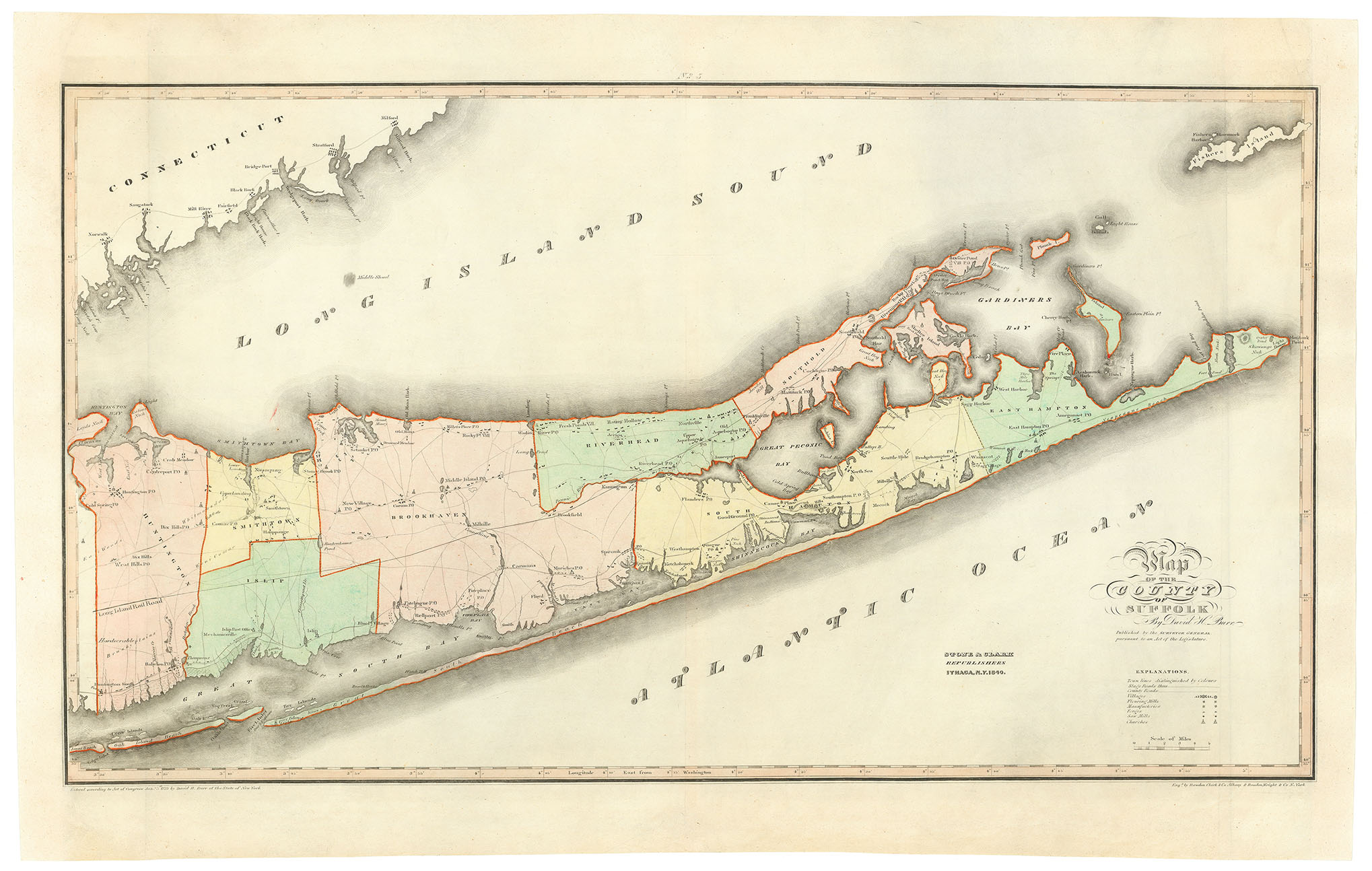 DESCRIPTION: The "Map of the County of Suffolk," masterfully engraved by David H. Burr, is a prominent feature in "An Atlas of the State of New York Containing a Map of the State and of the Several Counties. Projected and Drawn by a Uniform Scale...under the Supervision & Direction of Simon De Witt, Surveyor General." Celebrated as one of the finest 19th-century maps, it highlights Burr’s meticulous craftsmanship and attention to detail. This atlas, noted by historian Walter Ristow as a "magnificent publication," stands out as the second state-focused atlas ever published, significantly advancing the precision and dissemination of geographical knowledge. Burr’s work on this map exemplifies the high standards of cartography during the period, enhancing our understanding of New York’s landscape and administrative divisions at the state level.