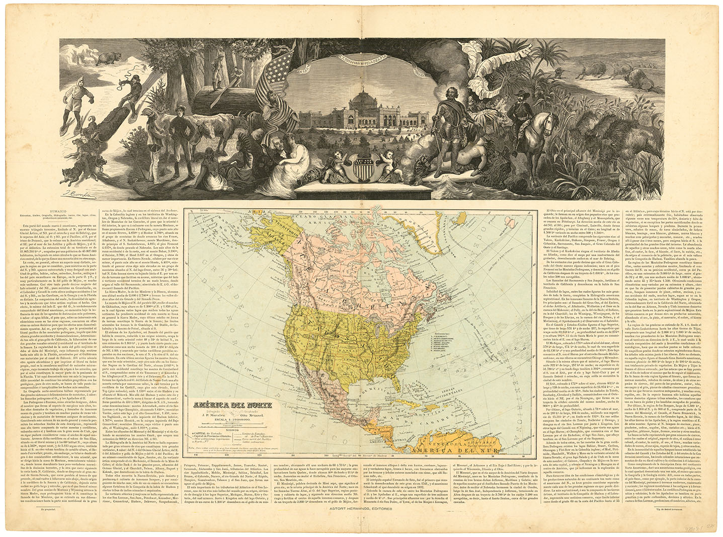 DESCRIPTION: A Spanish language map of North America published in 1876 by Astort Hermanos, featuring a large decorative vignette above the map. At the center of the vignette is an image of the main hall of the Centennial Exhibition in Philadelphia, flanked by scenes depicting American Indians, buffalo, snowshoeing, and other imagery symbolizing the American frontier and cultural identity.