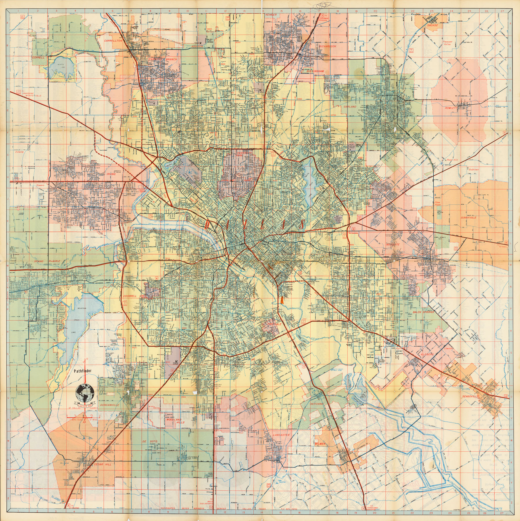DESCRIPTION: A road map for the Dallas Texas area. It seems that Geyer's Pathfinder maps was a short lived enterprise. Very little to no information can be found on the internet. On the verso is a large index, a map of the business section of Dallas and a detailed pictorial map of Fair Park, the home of the Texas State Fair,