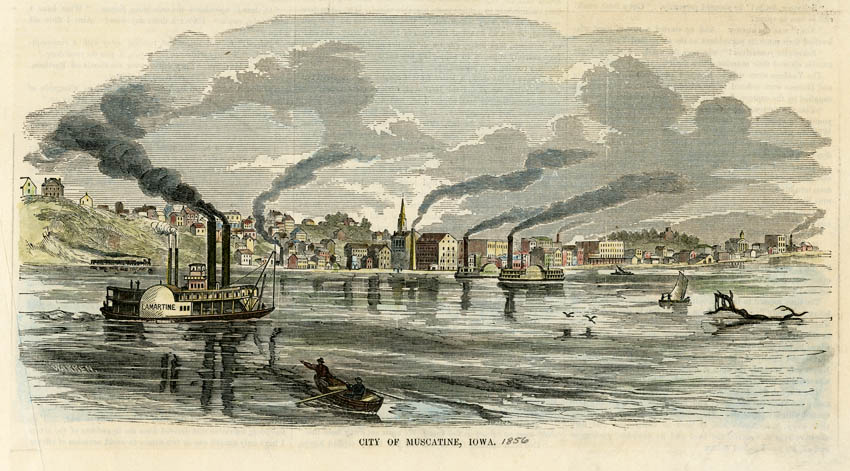 DESCRIPTION: A 19th-century perspective of City of Muscatine, Iowa, captured as a wood engraving and hand colored to highlight the details. <br><br> View of the the city with train along shore and the 'La Martine' steam paddle boat.